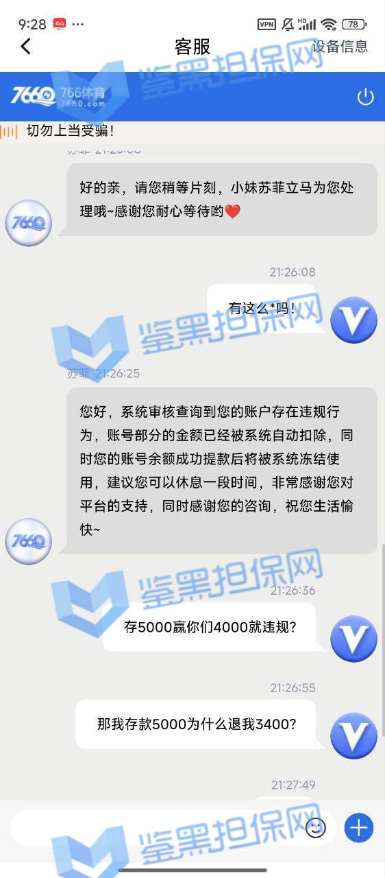 2、鉴黑担保网维权专员了解到此会员在PA真人游戏里面投注,提款迟迟未到账,会员联系平台客服得到的回复是投注过程中存在违规行为,故扣除部分金额退回3400元后冻结账号。